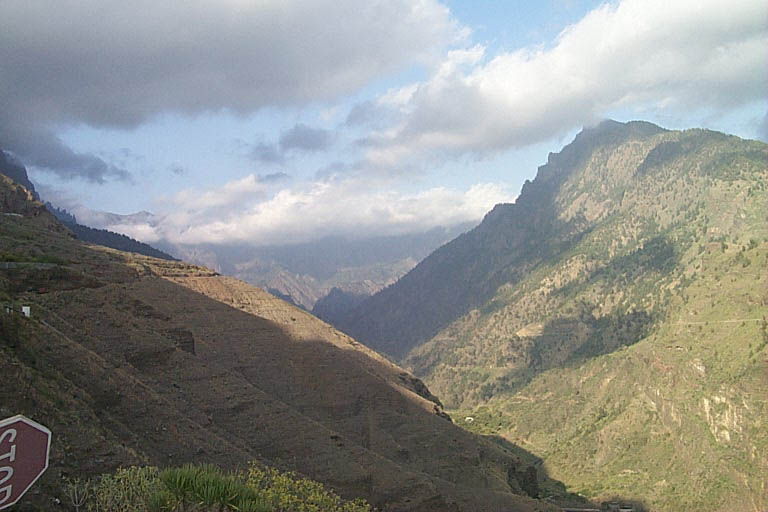 Vom Mirador del Time, dem Aussichtsplatz von dem aus es auf 50 Metern 500 Meter abwärts ins Meer geht, offenbart sich dieser Blick in die Caldera de Taburiente, den unter Naturschutz stehenden Ursprung der Insel.