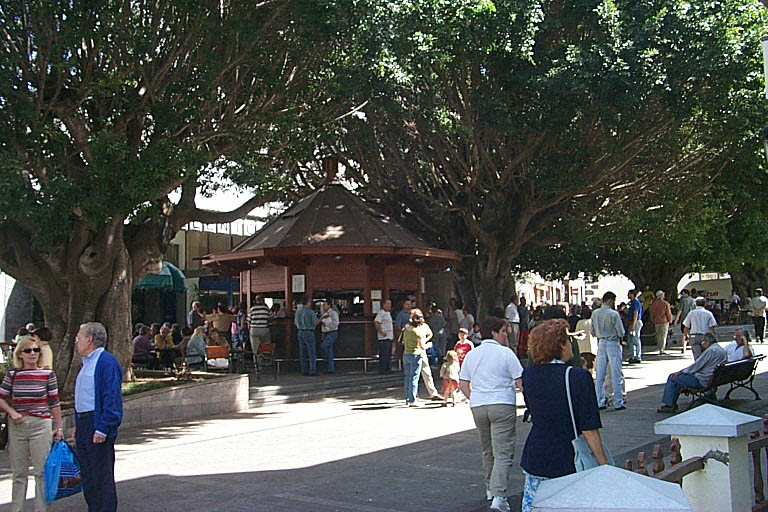 Unter Lorbeerbäumen kann man in Los Llanos Kaffee und andere Speisen udn Getränke genießen. Bis in den späten Abend hinein herscht hier ein ruhiger Trubel.