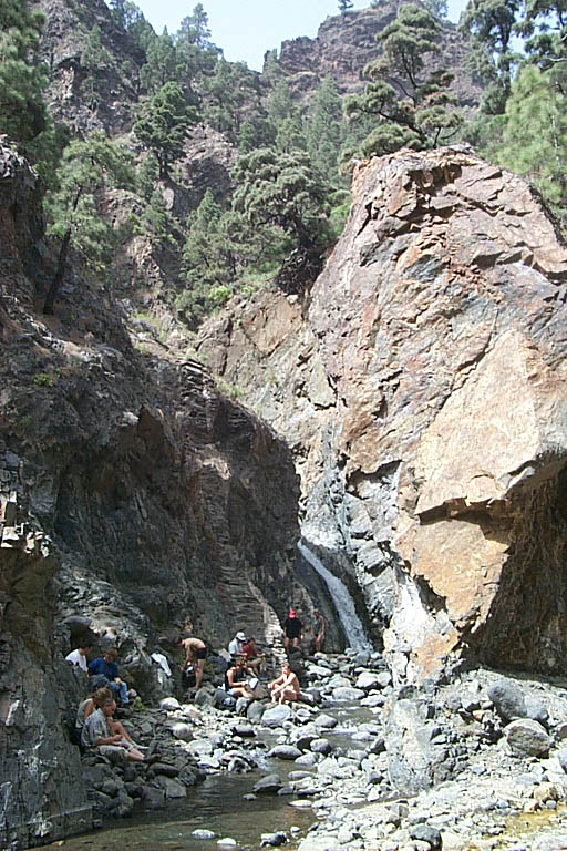 Dies ist der Unterschied zwischen La Palma und allen anderen Kanarischen Inseln: Das Wasser! Die 40 km lange Bergkette zwingt den Nord-Ost-Passat zum Abregnen. Die so aufgefangenen Wässer ermöglichen nicht nur die umfangreiche landwirtschaftliche Nutzung auf Bananenplantagen sondern auch solche Naturschauspiele wie diesen Wasserfall (in der Nähe von Dos Aguas)!